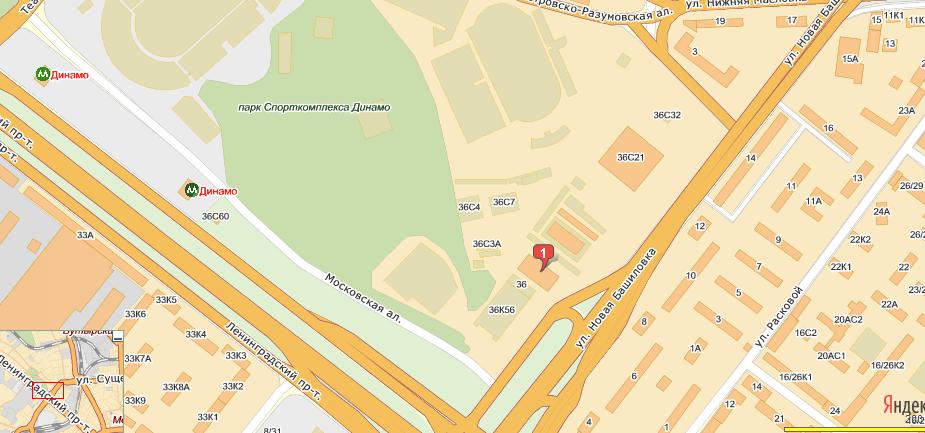 Москва, Лениградский проспект 36. Площадка за бассейном. На схеме - красная метка "1"